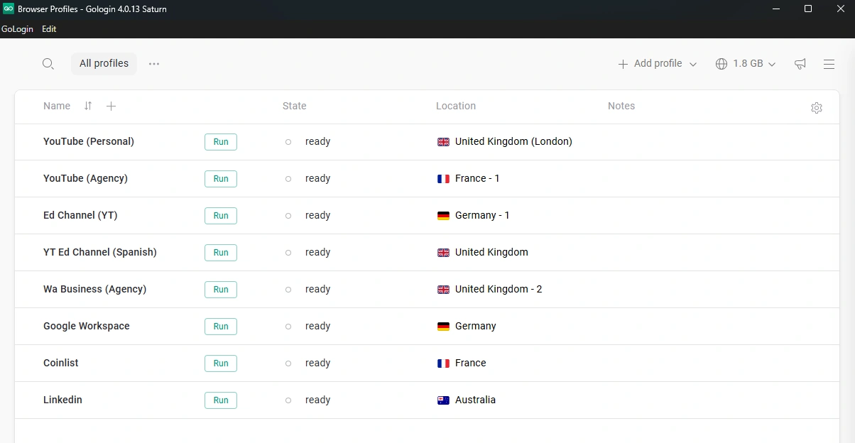 Gologin lets you create multiple browser profiles and log in to all your accounts inside them.
