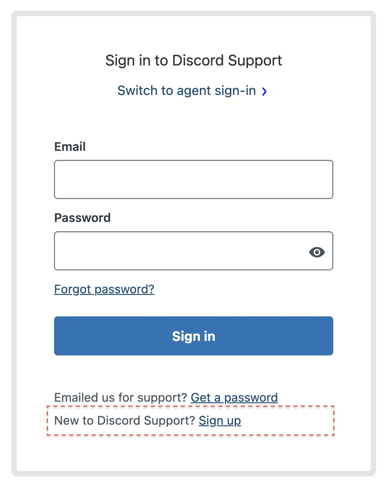 If you have never done this before, that means you don’t have a Discord Support account. In that case, click the sign-up link on the Discord Support sign-in page.