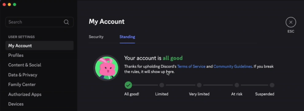 To know which one of these bans you’re facing, head to the User Settings > My Account > Standing. There you’ll find a summary of any violations performed by your account and the penalty imposed by Discord in return.
