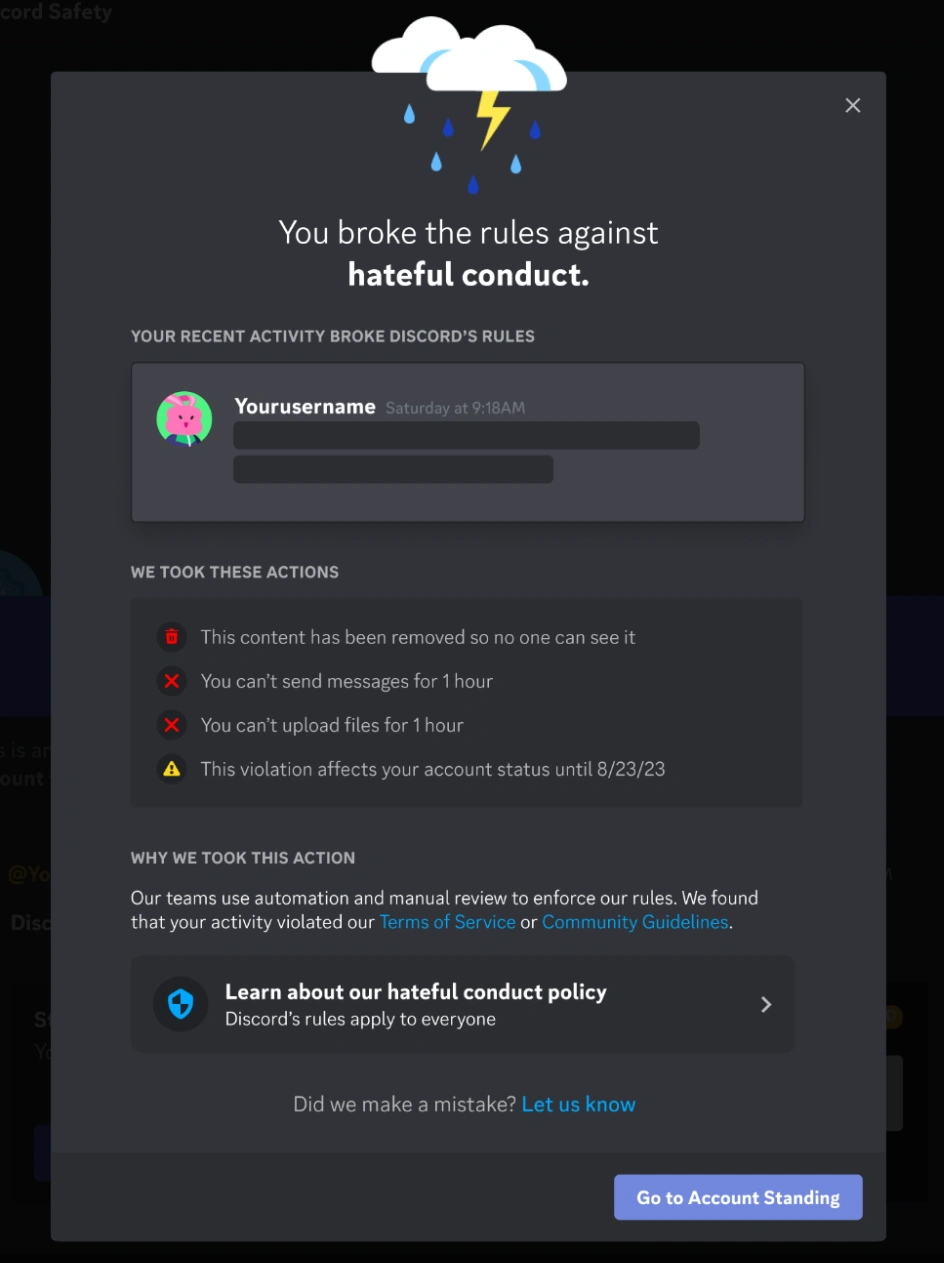 Discord admits that it can mistakenly issue violation notices and suspensions. That’s why it gives users a chance to ask for a review.